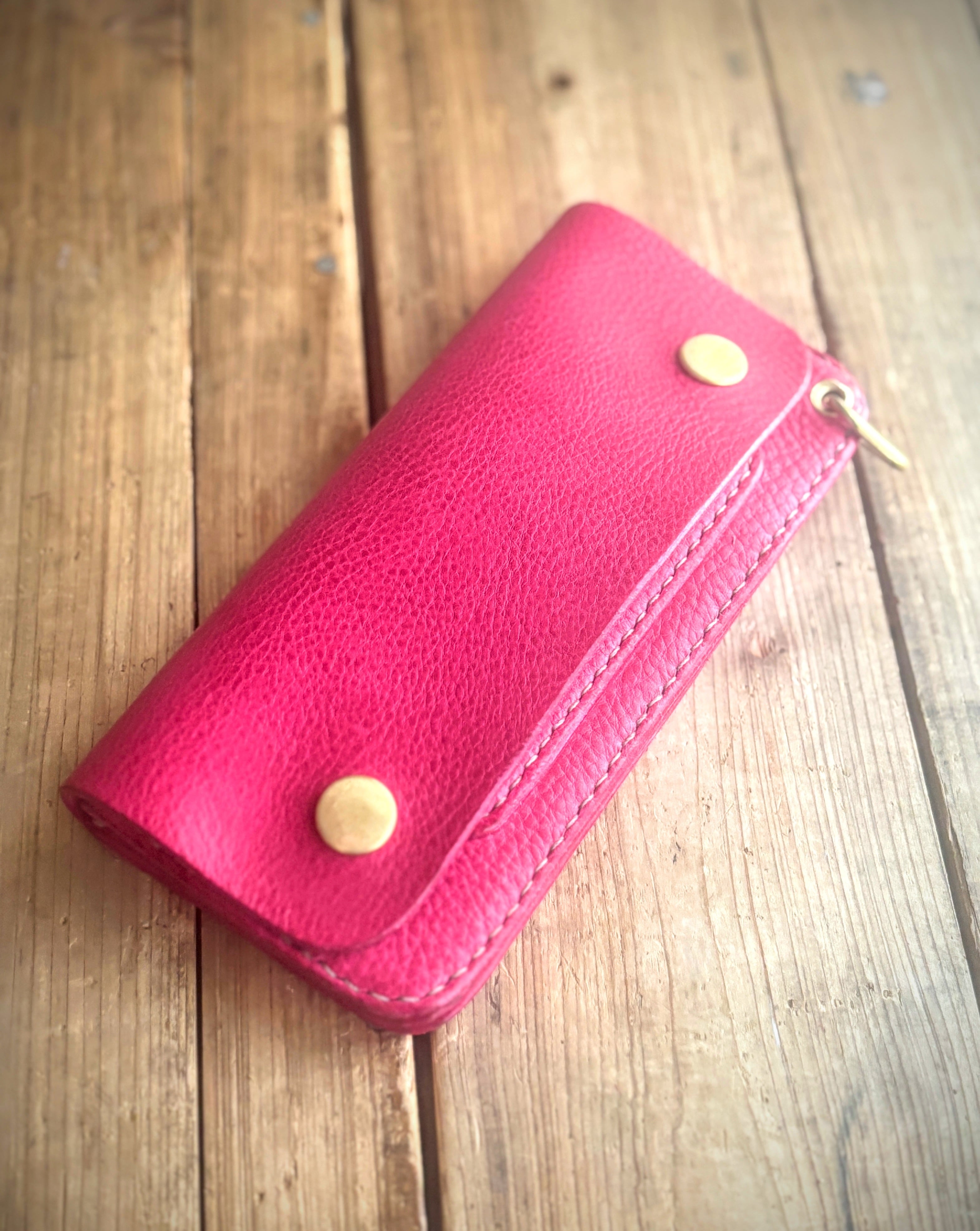 存在感のあるミドルウォレット • こだわりの象徴: 「既製品ではない、職人の手仕事」を感じさせる無骨なディテールは、テーブルに置いているだけで絵になります。 • 育てる楽しみ: ベルト部分は一番触れる場所。だからこそ、本体よりも早く艶が出て、色の深みが増していきます。そのコントラストは、まさに自分だけの「作品」です。 革 イタリアンレザー リネアヴァスカリスシオ ピンク、ナチュラル 糸 ポリエステル サイズ 縦約11.5cm×横約9cm高さ約3cm お札はおらずに入ります。カードは約10枚ほど入ります。
