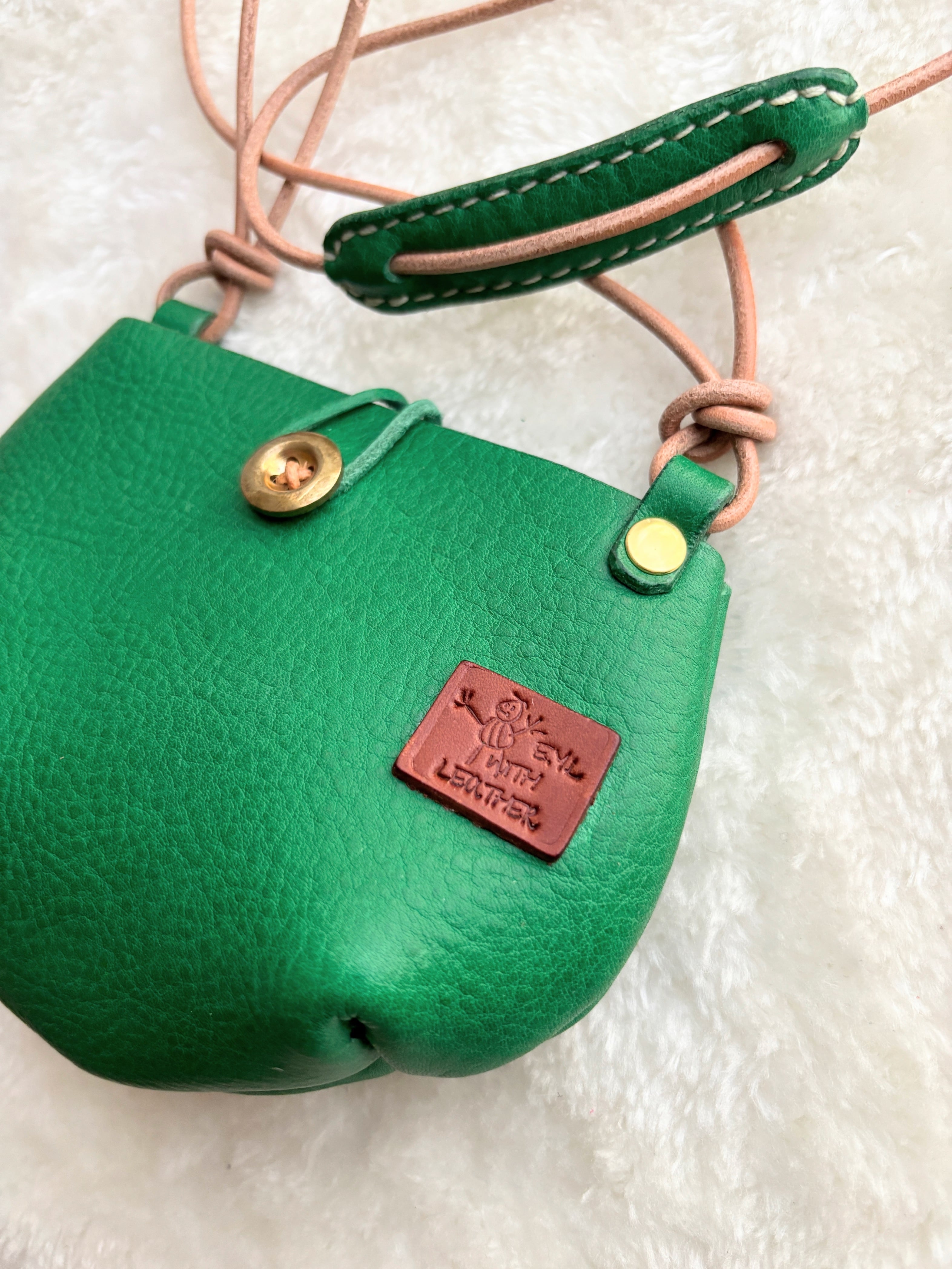 ぷっくりコロンとした2wayポーチ 革紐を両側へ対象にひっぱれば手持ちポーチに イベントやお祭りや初詣など、お着物や浴衣などに合わせてもかわいいデザイン また、後ろ側に革紐を全部引けばショルダーにもなります。 厚みのあるしっかりとした革を贅沢に使い、コロンとした存在感のあるポーチです。 低価格でお買い得になっております。 その為こちらはただ今一点のみになります。 革 イタリアンレザー 糸 ポリエステル ブラウン 金具 真鍮 紐 牛革紐