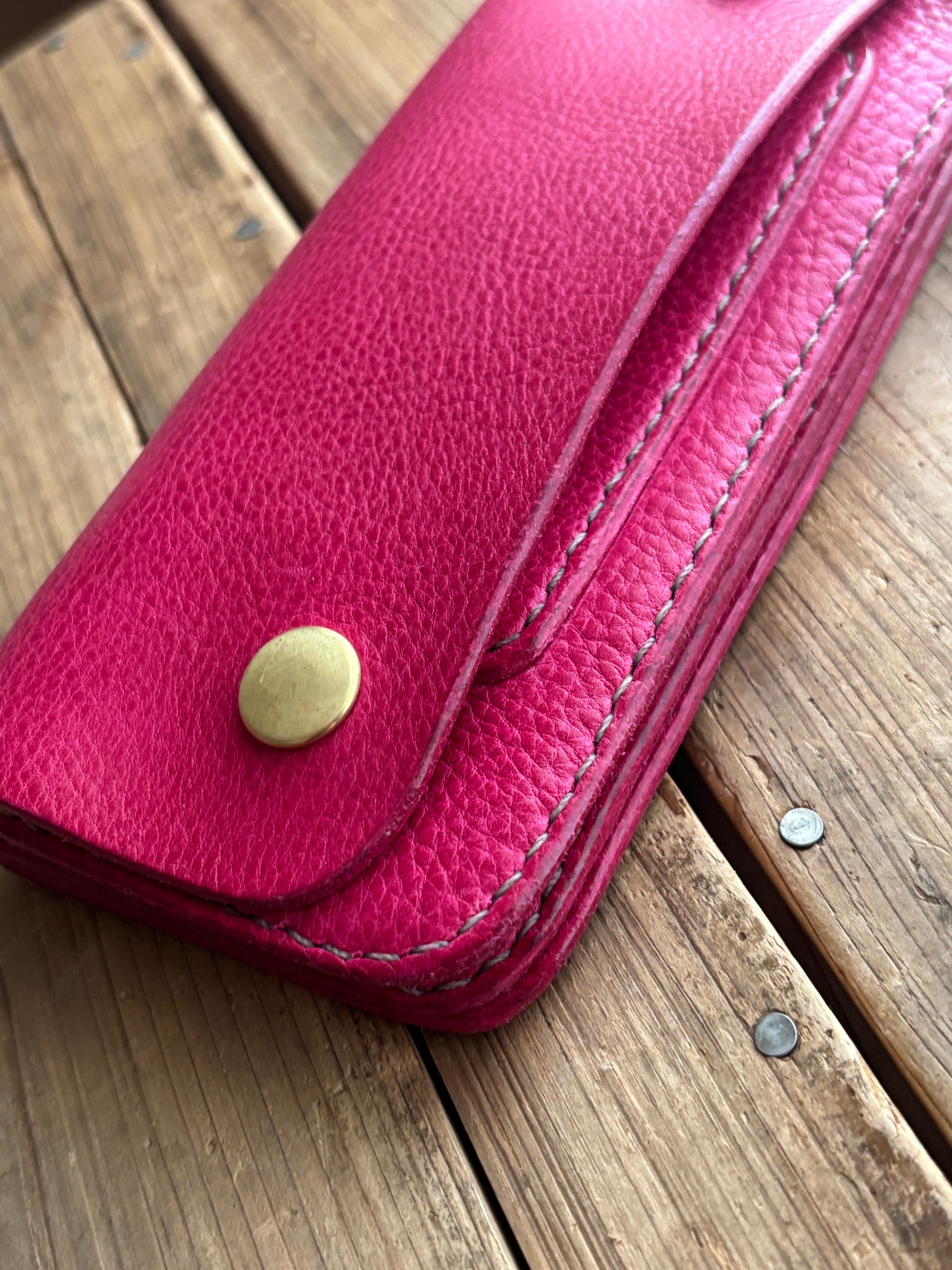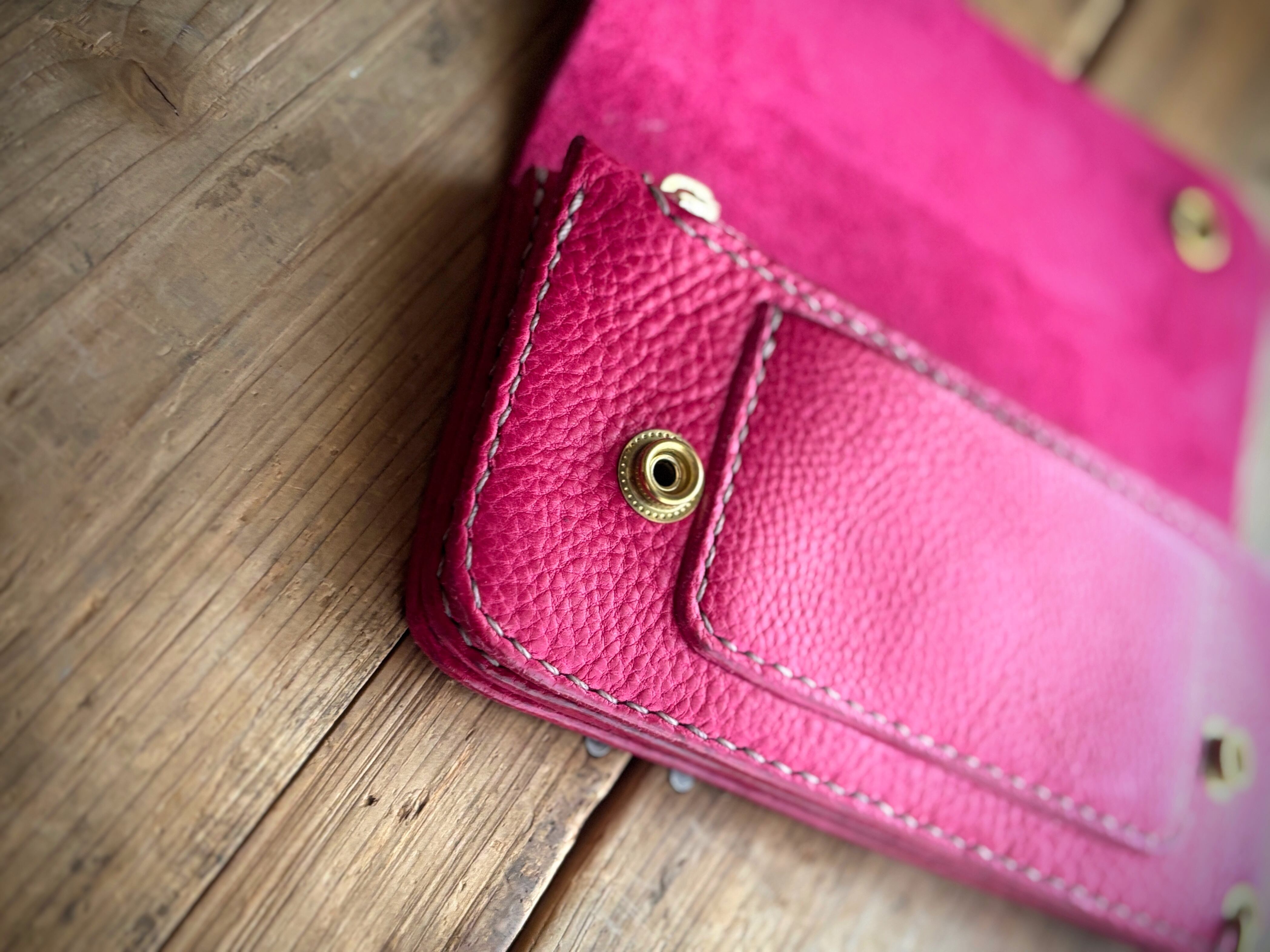 また、個性的なピンクは使い込んでくと深みのある赤ピンクになり艶もましていきます。是非経年変化もお楽しみください。