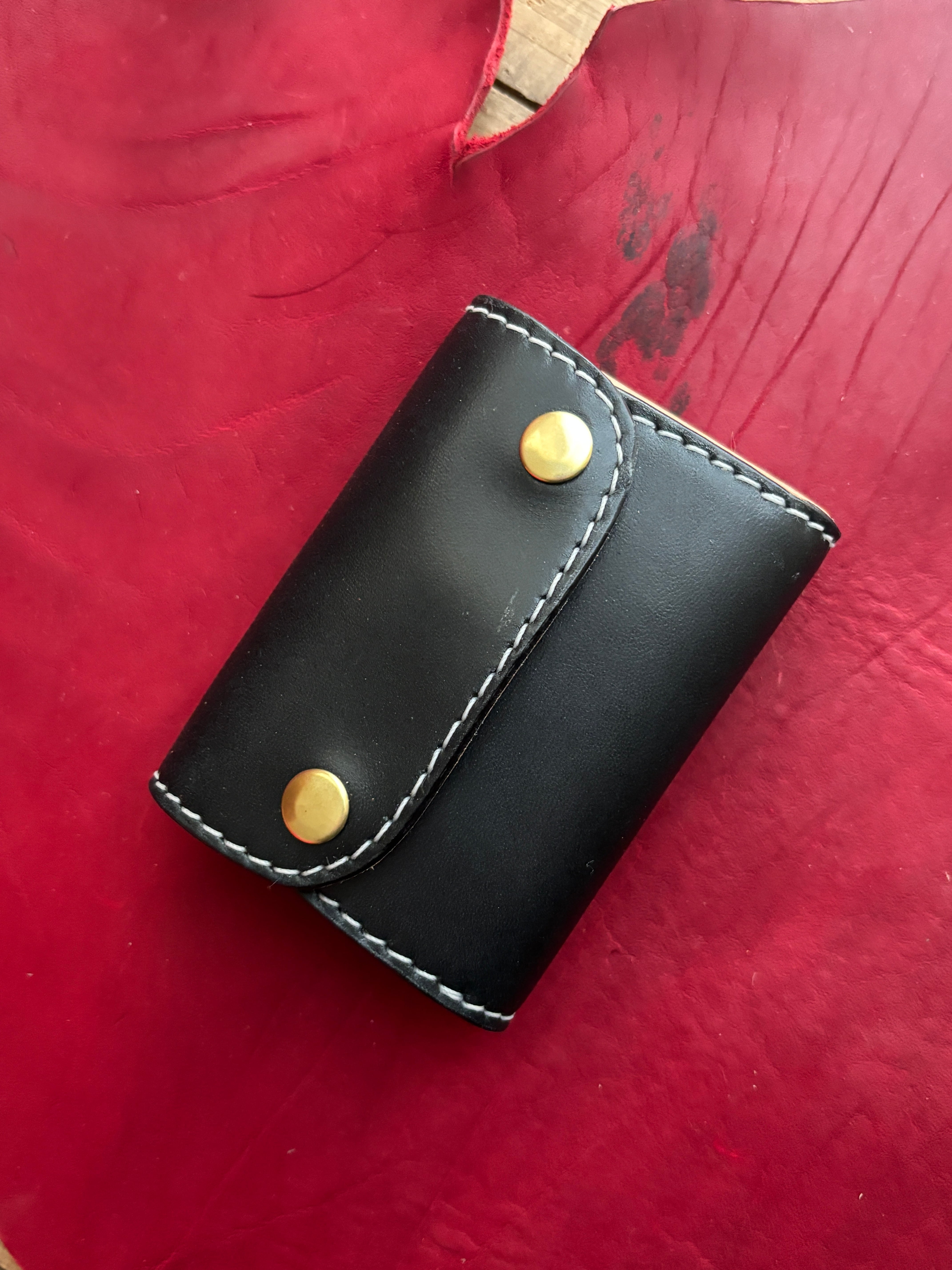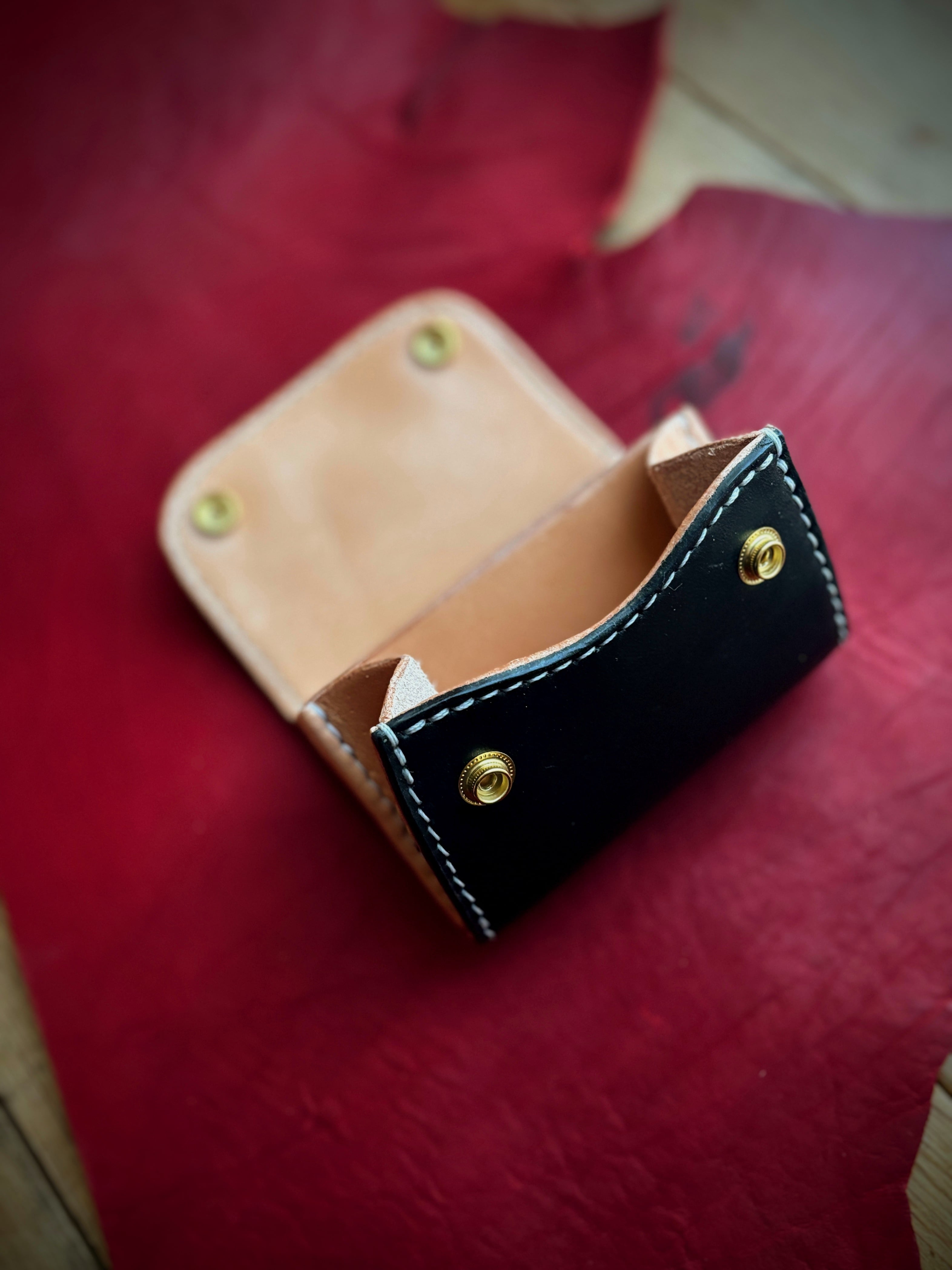 外装ブラック、内装ナチュラルのツートン仕立てのコンパクトおりウォレットです。