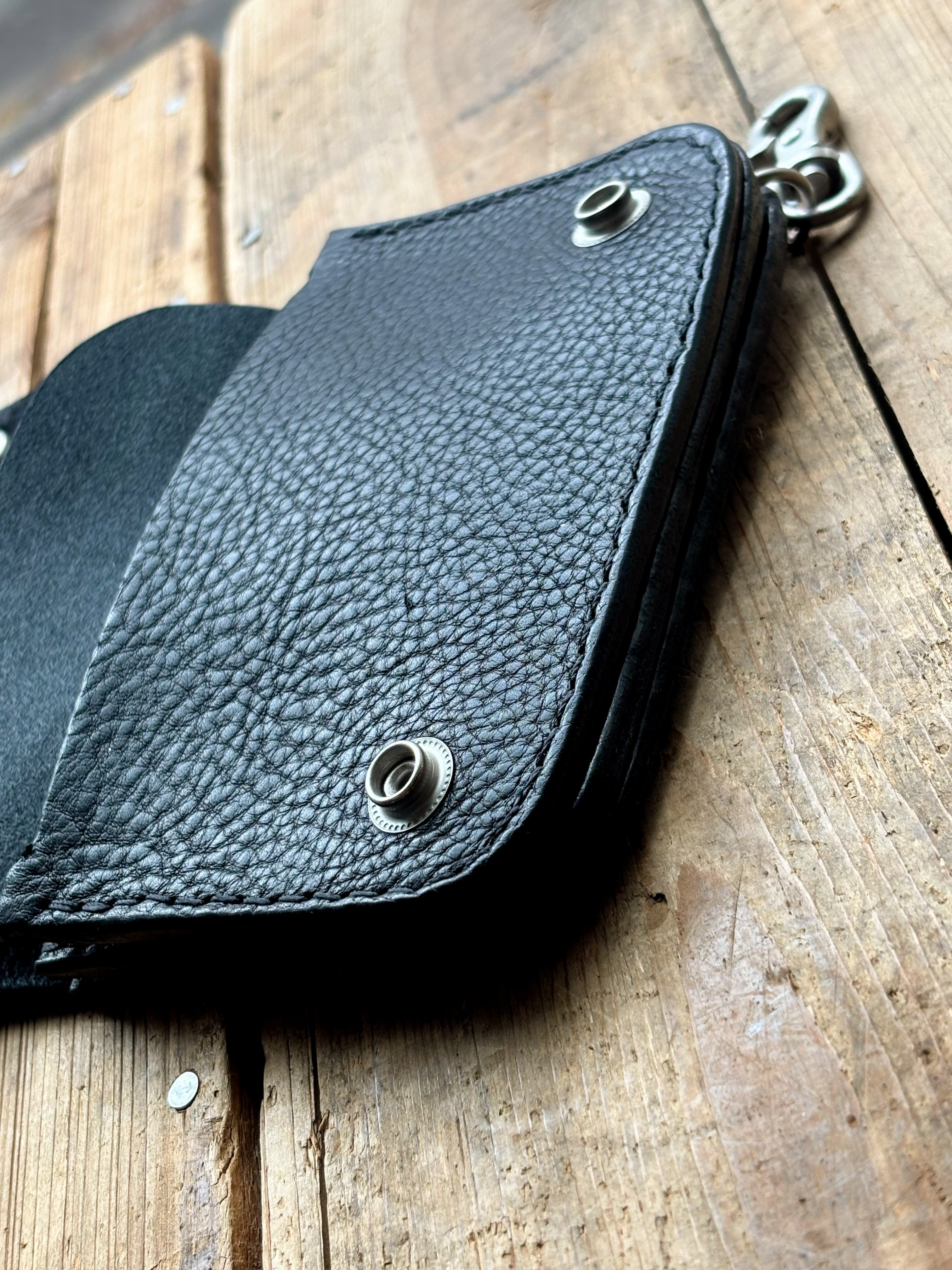 どことなくチープさがありつつイタリアンレザーのシボ革で上品さもあるトラッカーウォレットに仕立てました。